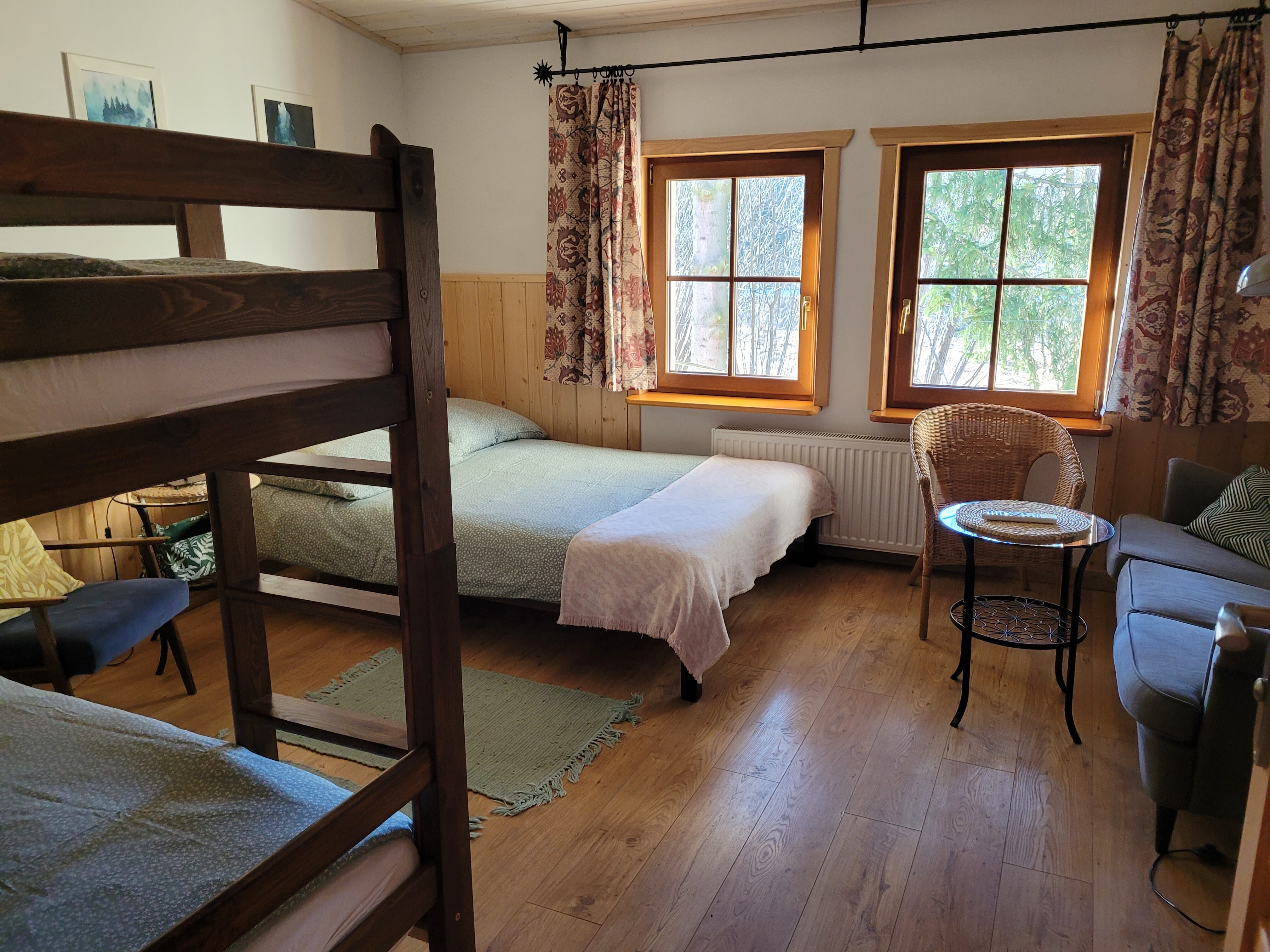 - Sypialnia czteroosobowa z łóżkiem podwójnym i dwoma łóżkami pojedynczymi